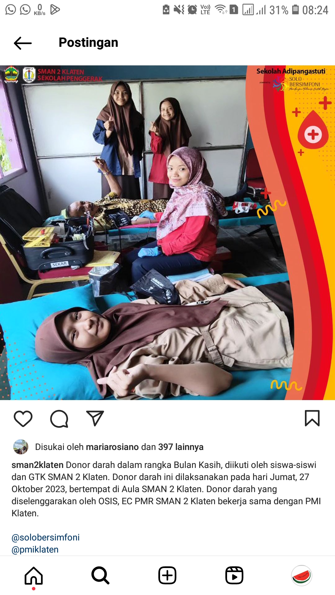 3 Keterangan Jawaban : Kegiatan Donor Darah di Aula SMAN 2 KLATEN link : https://www.instagram.com/p/Cy40KqKvA5b/?igshid=NzBmMjdhZWRiYQ==