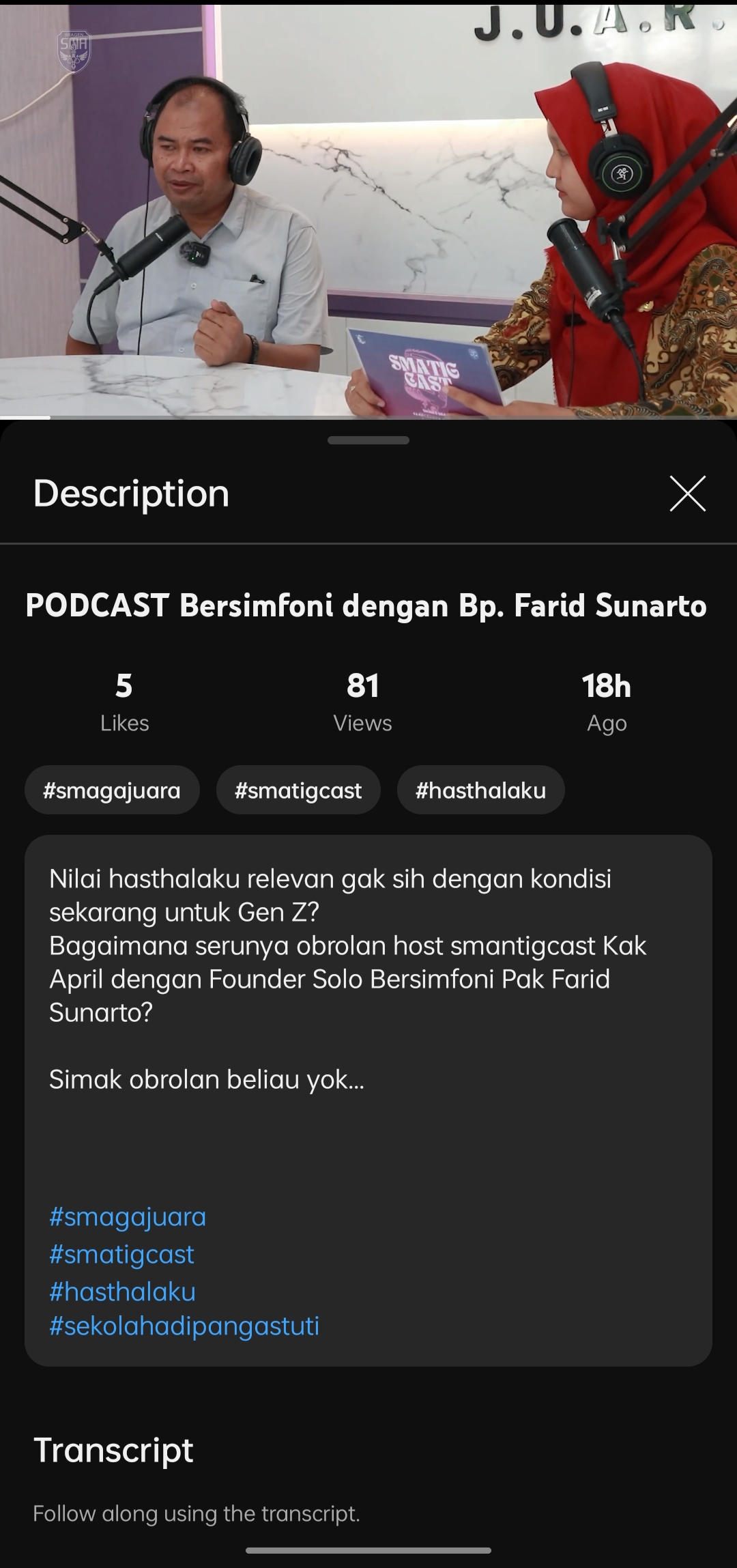 1. Terlaksananya pembuatan podcast / spotify tema Hasthalaku / Profil Pelajar Pancasila 2. Minimal 1x / bulan (minimal 6x selama program) 3. Diupload di channel sosial media sekolah |